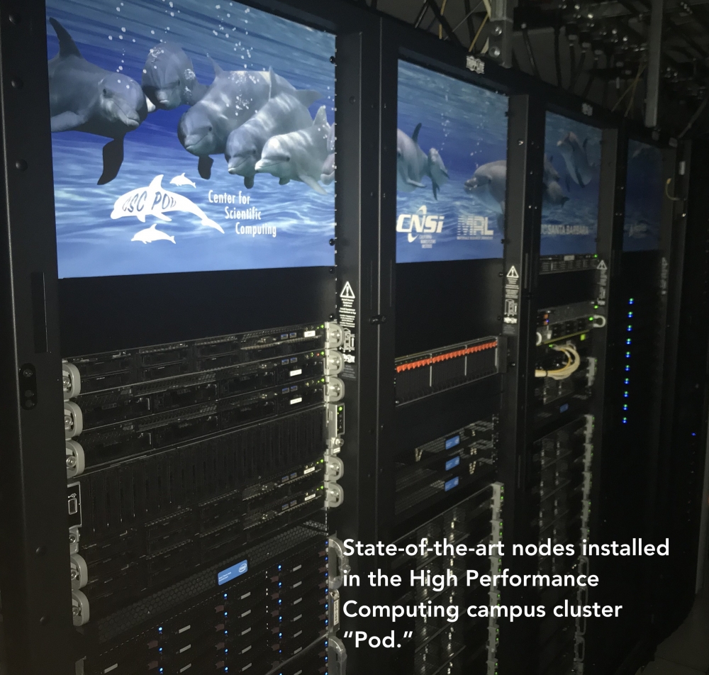 The Center for Scientific Computing (CSC) at the California NanoSystems Institute (CNSI) and the MRL is managing and maintaining the new system, which was funded by a $400,000 grant from the National Science Foundation to accelerate scientific computing workloads. The upgrade includes twelve compute nodes, with each one supporting four high-end NVIDIA Tesla V100 GPUs that are equipped with hardware double-precision processing, large (32 GB) memory, and NVLink for fast inter-GPU communications. Ten of the nodes were added to the existing High Performance Computing (HPC) campus cluster “Pod” that has three GPU nodes as part of its complement of computing nodes. The HPC cluster is currently available to UCSB researchers. The two remaining nodes became part of the delocalized Pacific Research Platform Nautilus cluster, headquartered at UC San Diego, which connects a few dozen universities along the West Coast including UCSB. CSC staff plan to continue hosting seminars, workshops, and webinars to help attain proficiency with the new cluster.