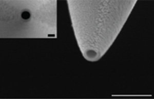 In Young’s research, he combines nanofabrication and electronics to investigate the properties of electronic states in quantum materials. He can use the 3D-printed tool to create what he calls a nano-SQUID, or superconducting quantum interference device, and attach it to the tip of an atomic-force microscope to enhance its ability to characterize materials. The image (right) shows a nano-SQUID that Young would be able to print in-house.