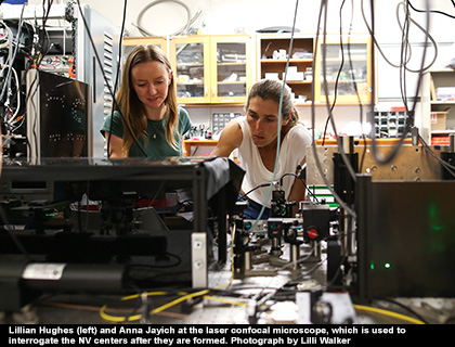 The NV center in diamond consists of a nitrogen atom, which substitutes for a carbon atom, and an adjacent, missing carbon atom (the vacancy).“The NV center defect has a few properties, one of which is a degree of freedom called a spin — a fundamentally quantum mechanical concept. In the case of the NV center, the spin is very long lived,” Jayich says. “These long-lived spin states make NV centers useful for quantum sensing. The spin couples to the magnetic field that we're trying to sense.”