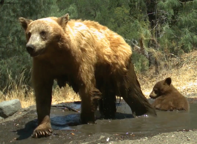 A bear and her cub as photographed by a remote camera "trap" at a Sedgwick Range Reserve watering hole.
