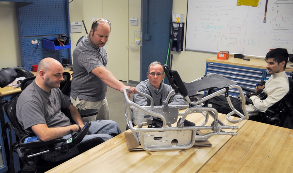 Rory Cooper (seated at center) and fellow HERL researchers examine a frame for a wheelchair being developed at the lab.