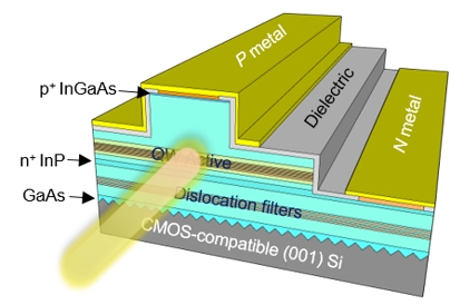 A 3D schematic representation of indium phosphide (InP)-based quantum well lasers on complementary metal-oxide semiconductor (CMOS)-compatible (001) silicon.